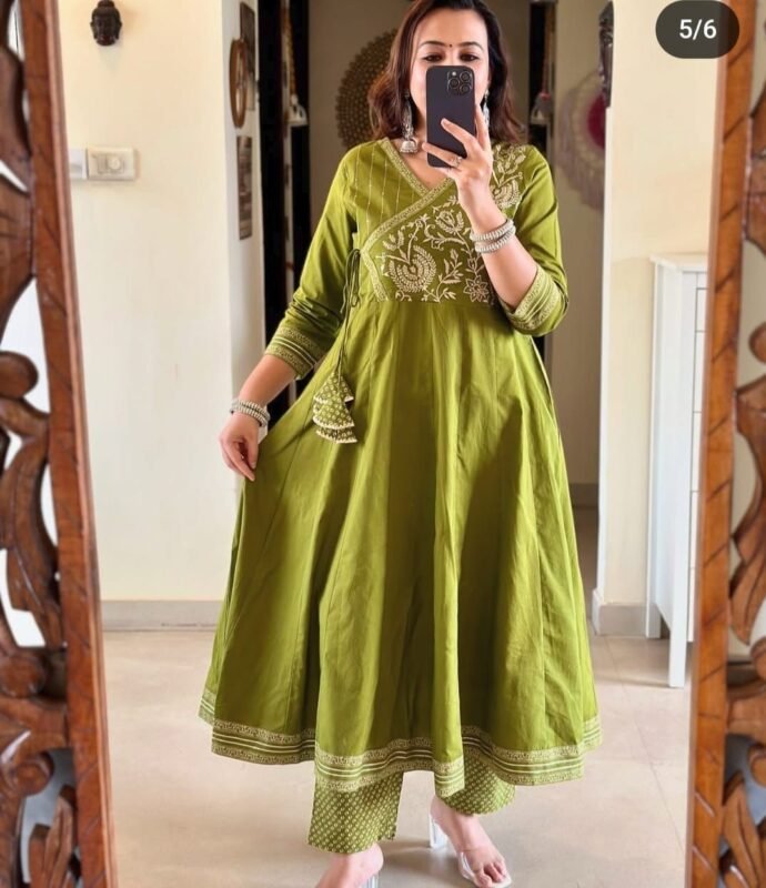 Work __ full heavy computer embroidery work on kurti Angrakha style and hand block printed border with gotta las work on kurti
