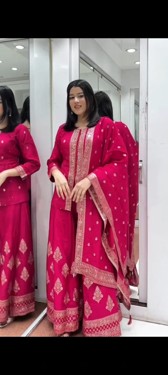 Elegance meets comfort with this stunning *Banarasi Silk*, paired with a **Jequard Wiving Sharara** and a beautifully crafted **Banarasi Silk With Jequard Wiving Dupatta**. 🌟